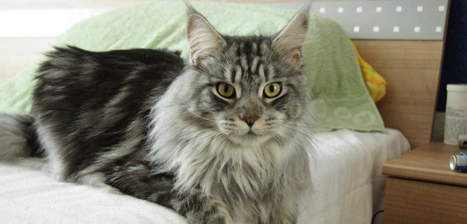 1. Maine Coon: una raza conocida por su gran tamaño y su largo y grueso pelaje, se cree que esto se debe a su origen en un clima frío. Su pelo es denso, resistente al agua lo que le permite tener grandes patas que resisten climas extremos.