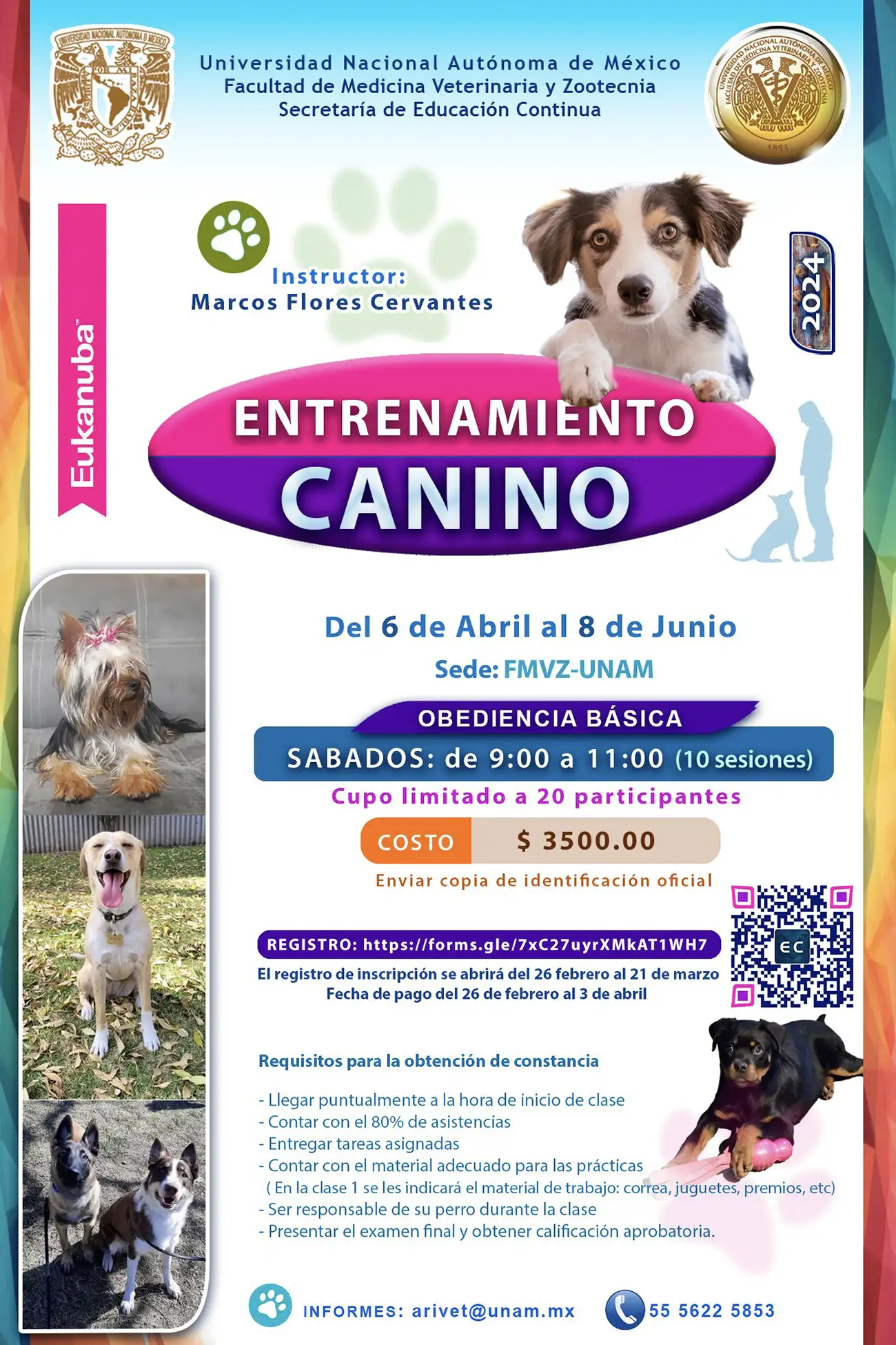 La Universidad Nacional Autónoma de México, Facultad de Medicina Veterinaria y Zootecnia, Secretaría de Educación Continua, lo invitan a participar en su Entrenamieto Canino.