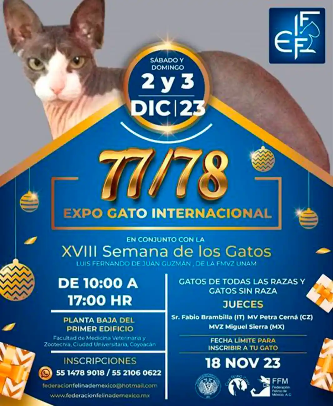 La Universidad Nacional Autónoma de México, Facultad de Medicina Veterinaria y Zootecnia, Secretaría de Educación Continua, Departamento de Medicina, Cirugía y Zootecnia para Pequeñas Especies, lo invitan a Expo Gato Internacional, en conjunto con la XVIII Semana de los gatos.