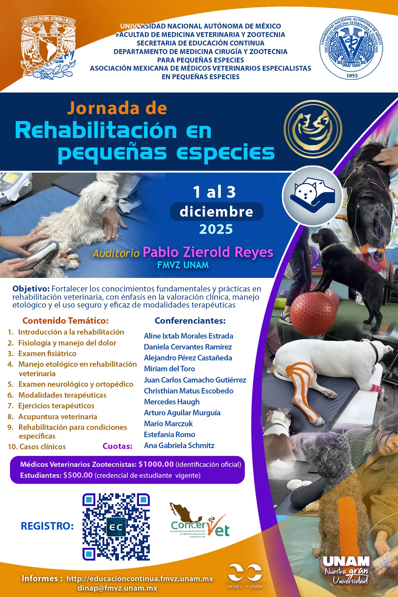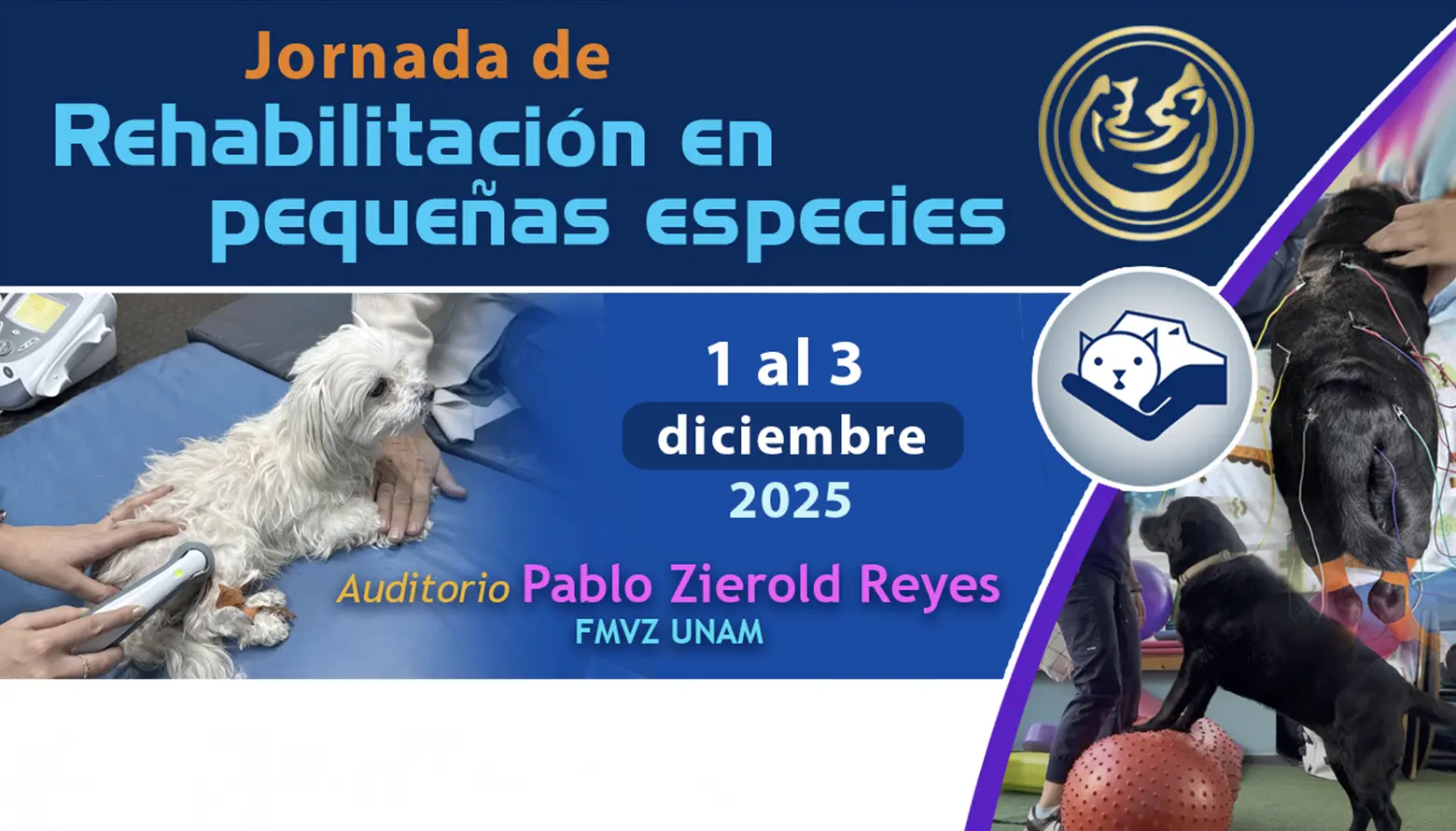 La Universidad Nacional Autónoma de México, la Facultad de Medicina Veterinaria y Zootecnia, la Secretaria de Educación Continua y el Departamento de Medicina Cirugía y Zootecnia para Pequeñas Especies te invitan a la Jornada de rehabilitación en pequeñas especies.