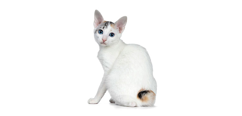 Apariencia general: El gato Bobtail japonés tiene líneas elegantes y musculatura bien desarrollada. La cabeza está finamente cincelada con orejas grandes y verticales y ojos grandes y redondos con una inclinación pronunciada. La cola, cuando se lleva normalmente, solo se extiende alrededor de 5 a 8 cm.